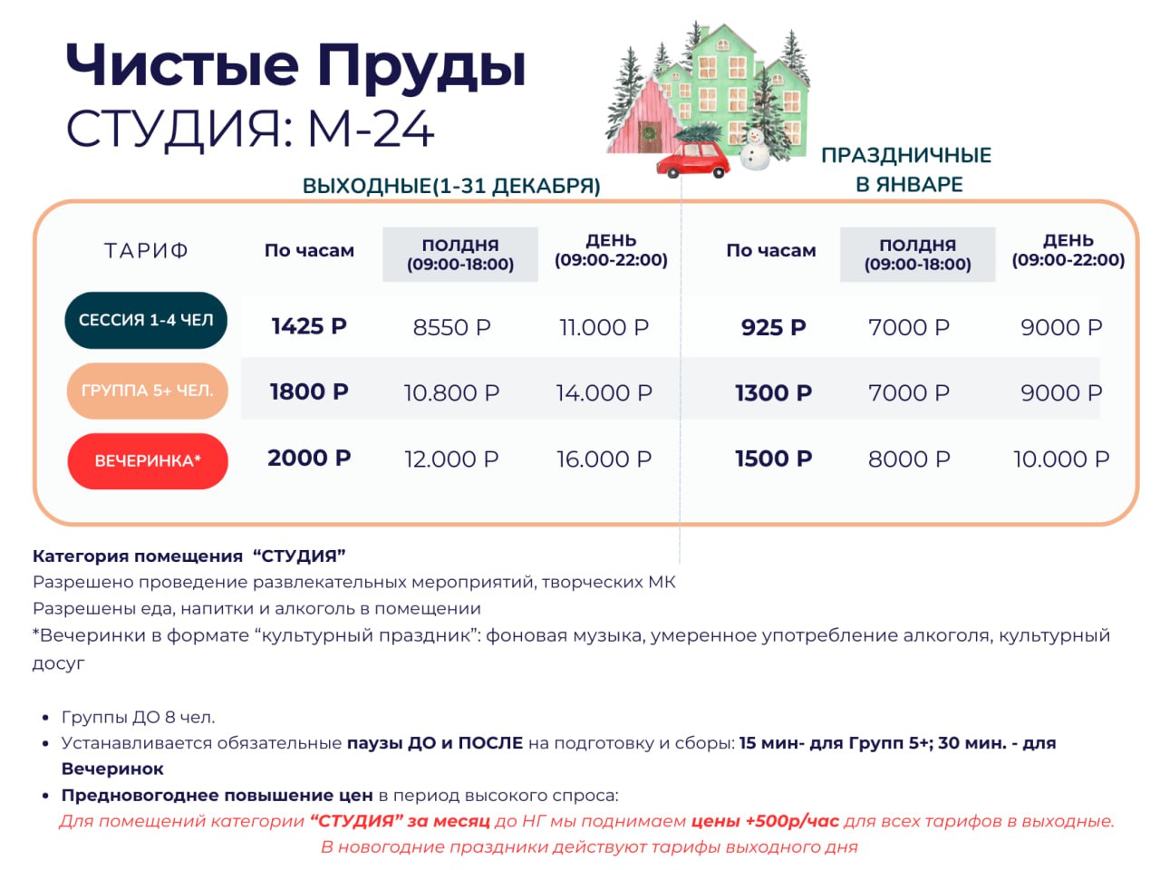 Уборка - 500 ₽ *1) окончание аренды после 22:00 (для групп 5+ чел.); 2) мероприятия с едой и напитками; 3) праздники и мастер-классы